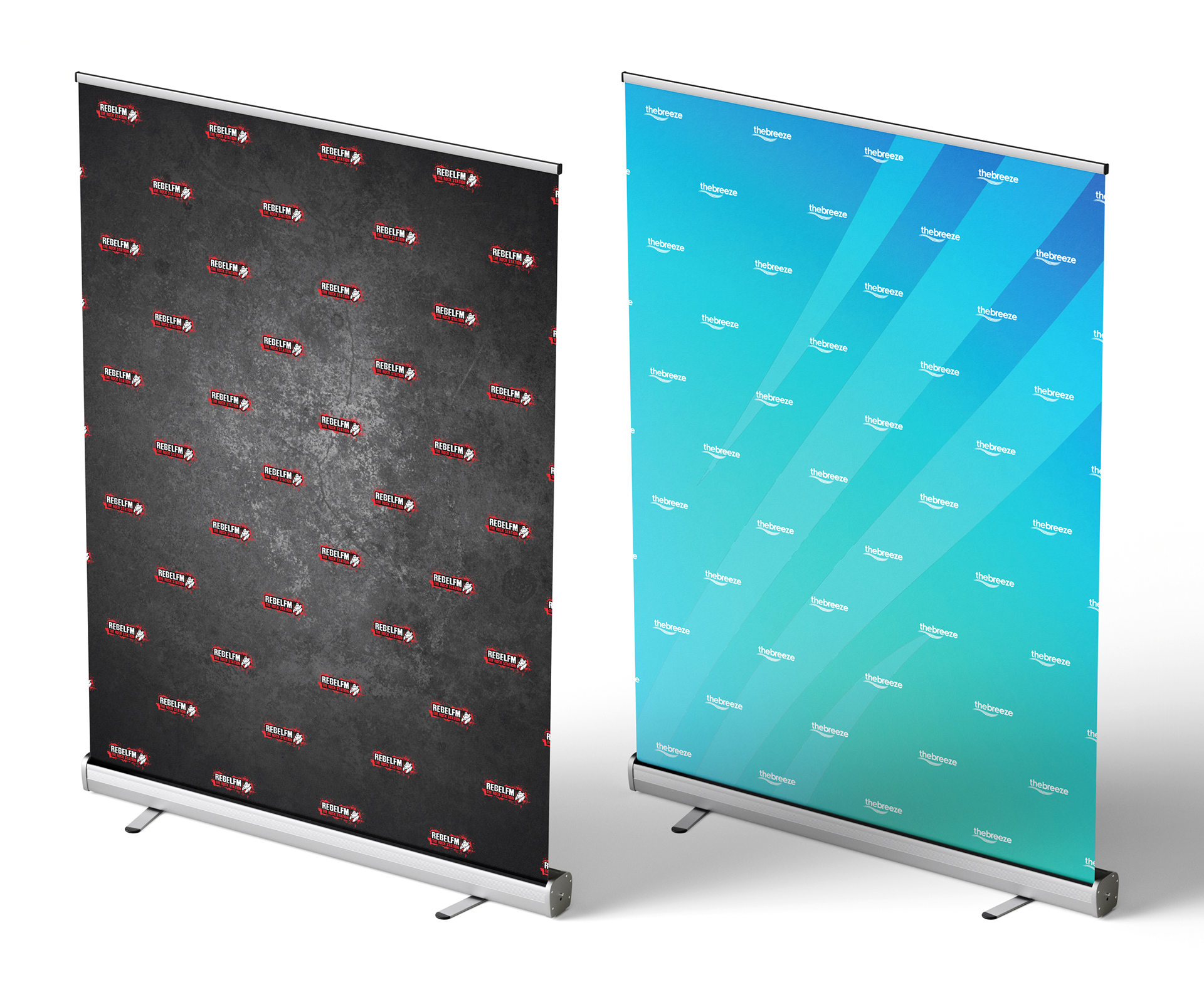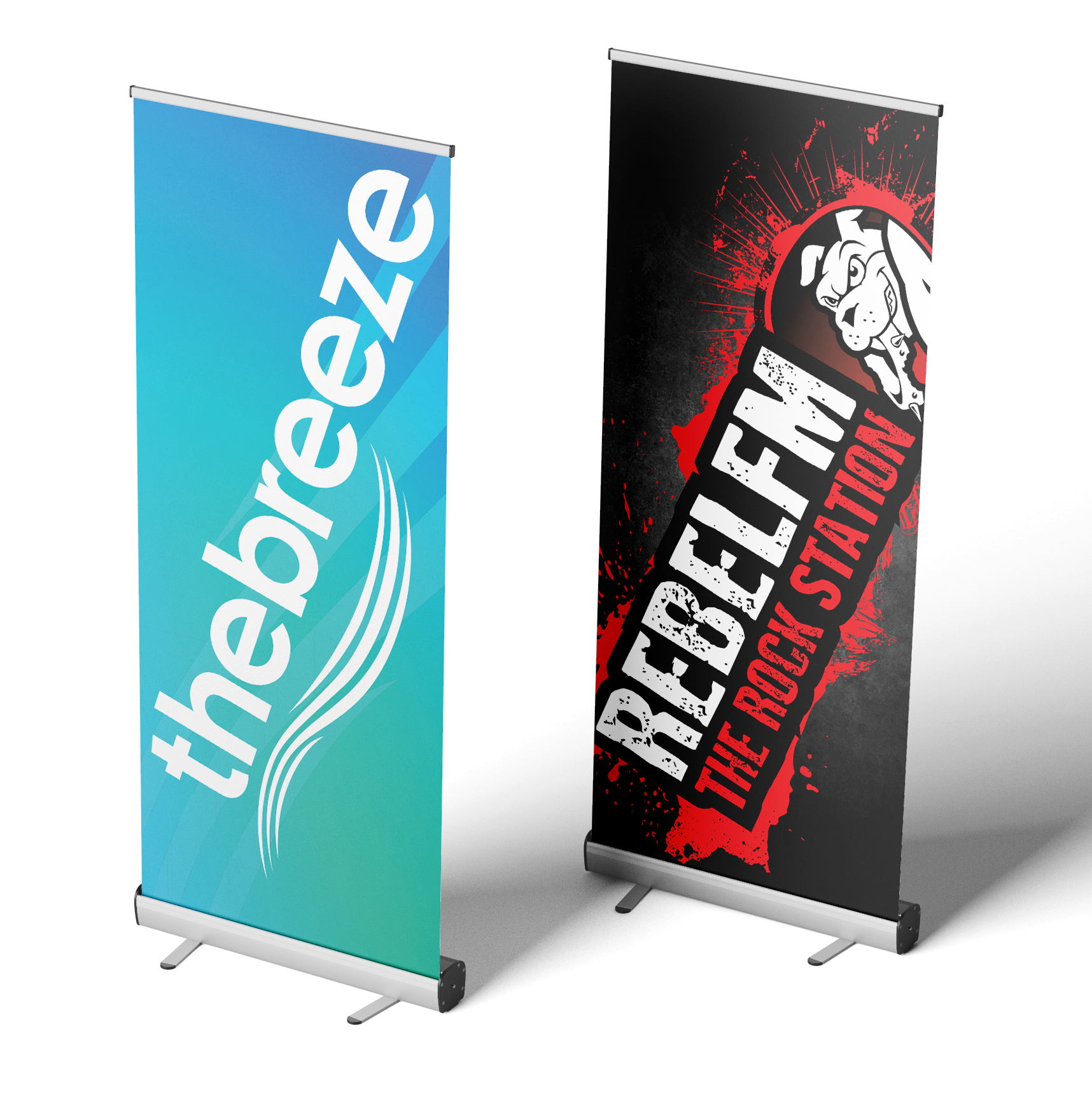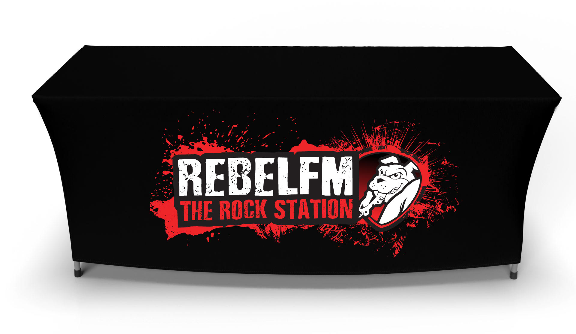 Media walls and pullup banners for Rebel FM and The Breeze. Stretch table cover for Rebel FM