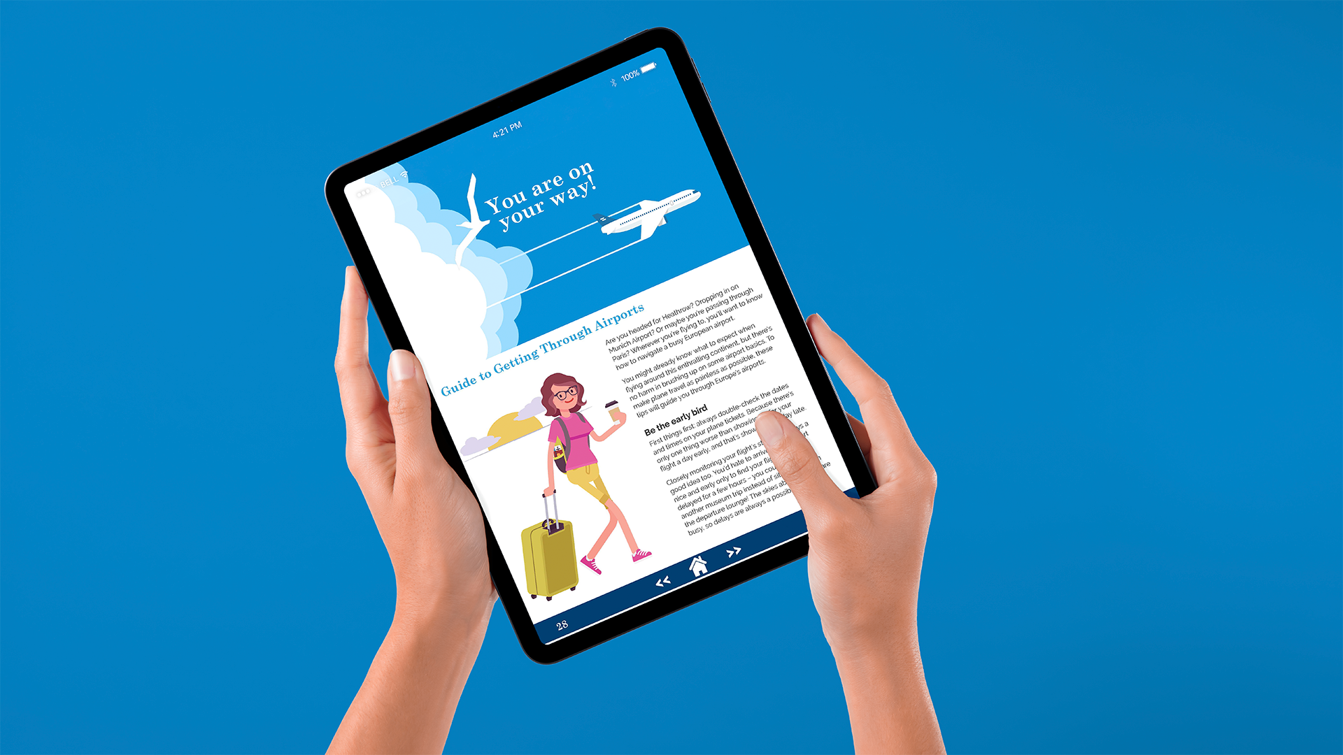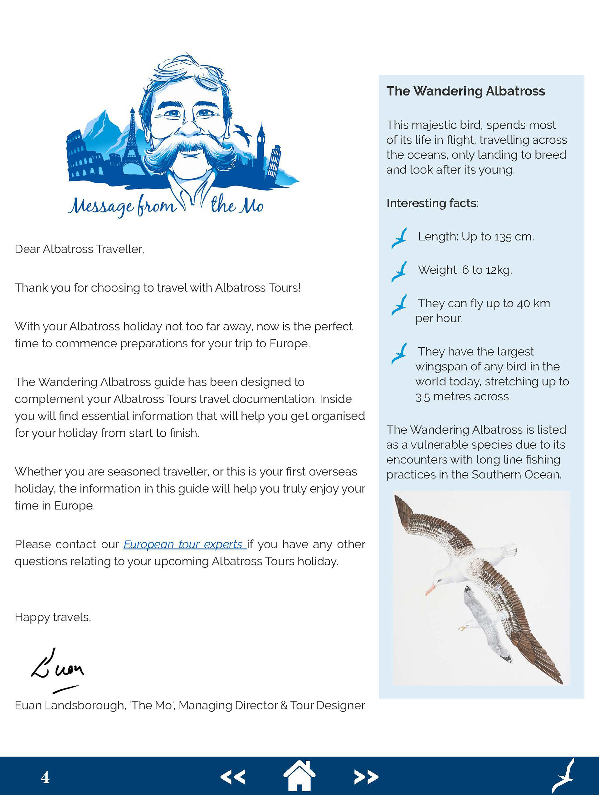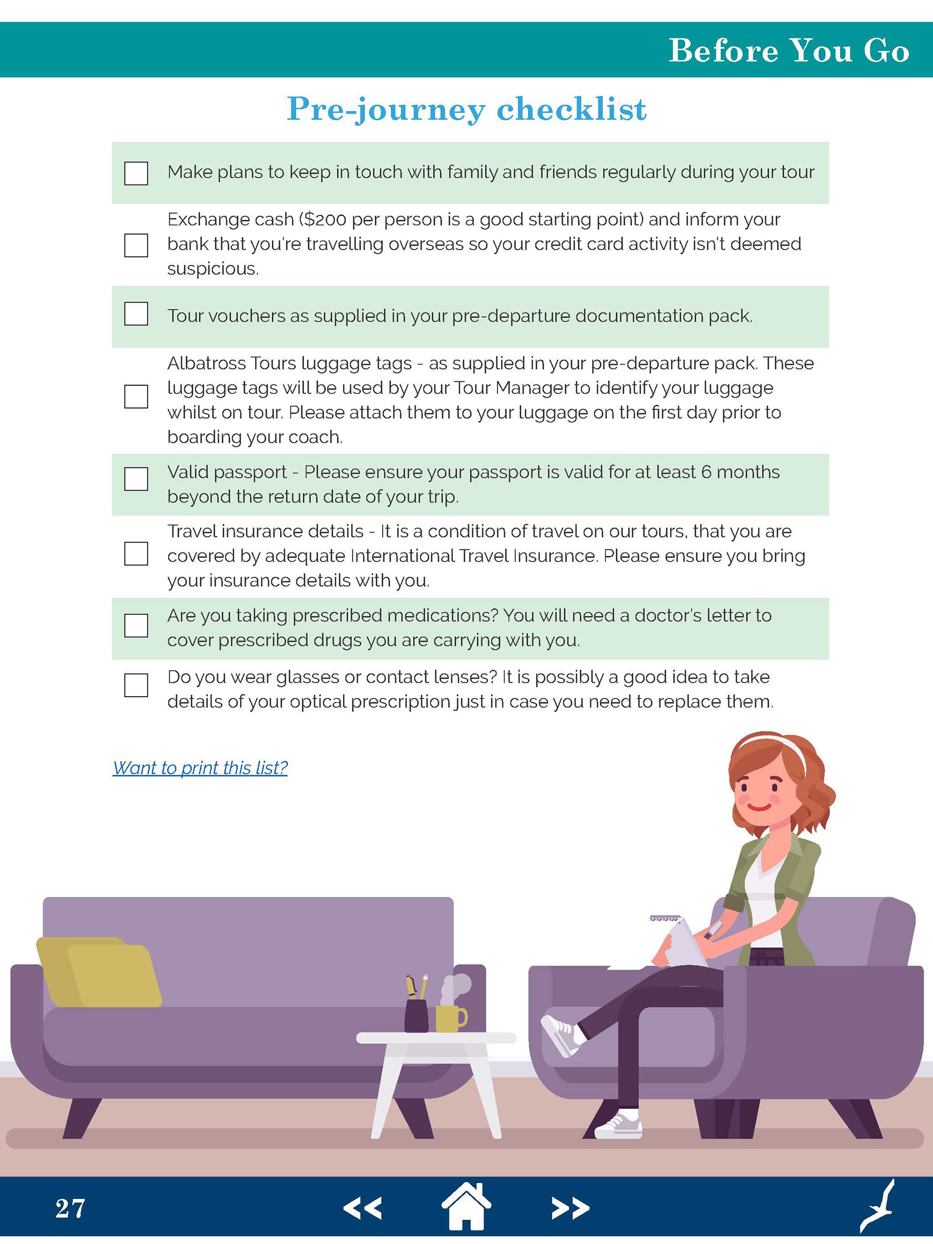 Albatross Tours required a comprehensive onboarding solution to prepare customers for long-haul European tours. The target demographic (55+) needed a format that was accessible, highly legible, and easy to navigate on tablet devices without requiring consistent internet access.