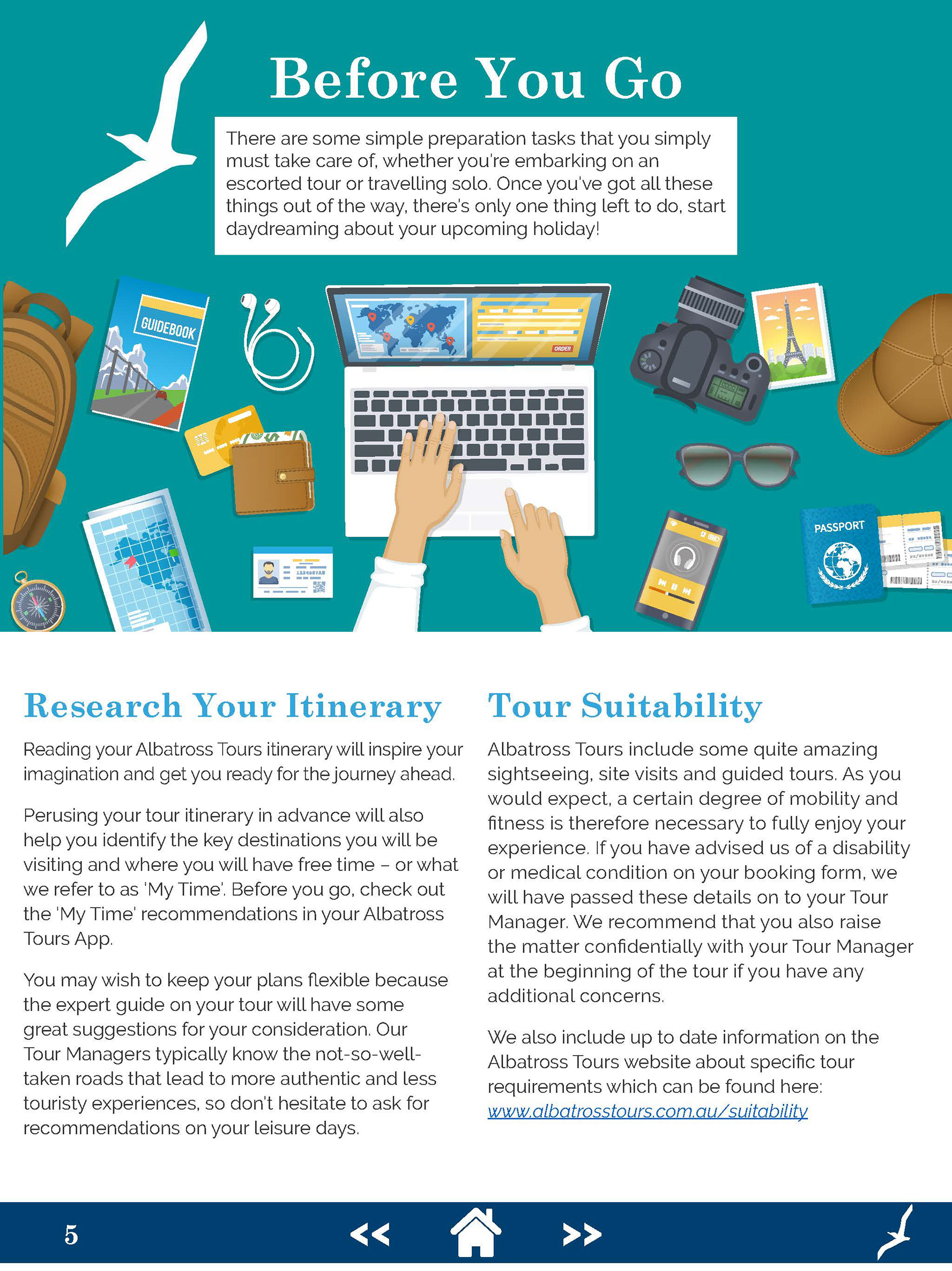 The guide was designed to live seamlessly within the existing Albatross Tours visual identity. By strictly adhering to corporate fonts, colour palettes, and styling, I ensured the digital experience felt familiar, trustworthy, and cohesive with the customer's prior booking touchpoints.